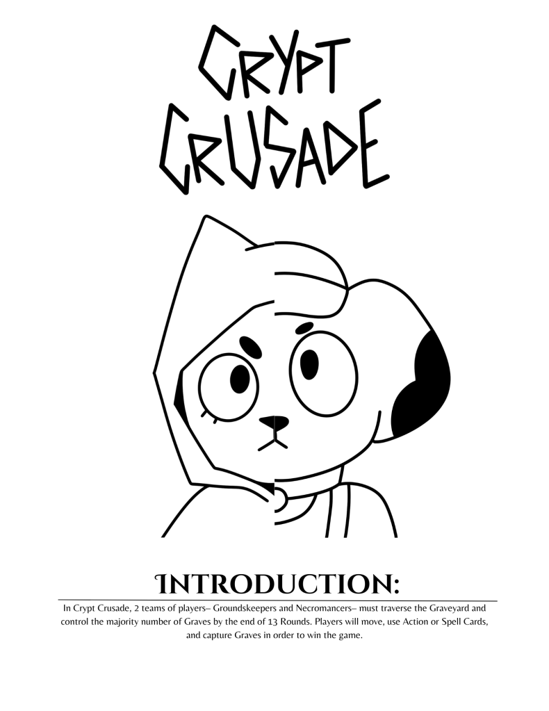 Description: Crypt Crusade is a territory building board game about Necromancers and Groundskeepers duking it out to control a graveyard. Players must take graves and play cards to get ahead – or push their opponents further behind! The game incorporates cards, a territory mechanic, and some novel pieces.