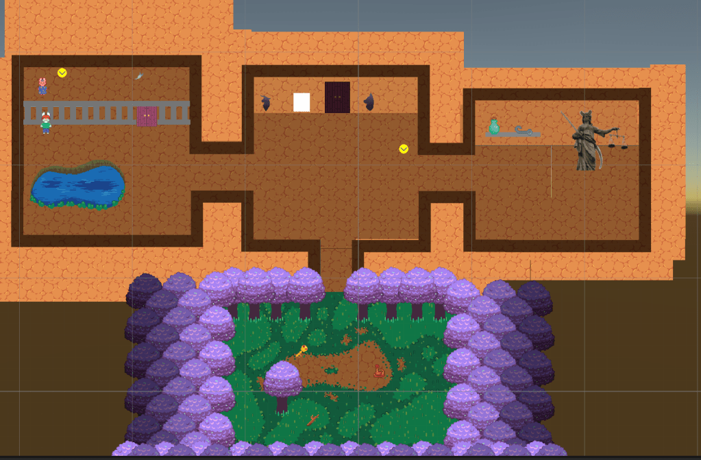 We wanted to create a dichotomy between the cutesy pixel art of the game and the dark, creepy moments when the mysterious creatures tries to take control. This led to most of the game being bright and pastel, with our horror segments being dark and disquieting.